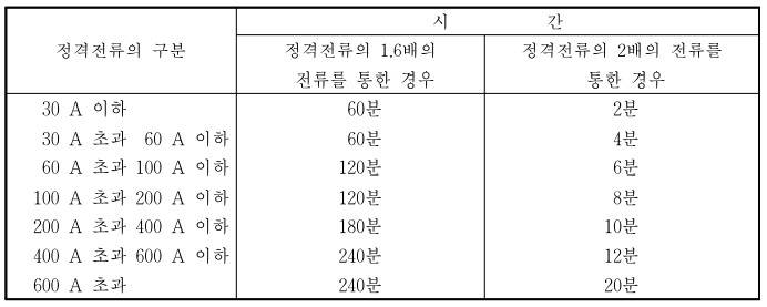- 1. 정격전류의 1.1배의 전류에 견딜 것.