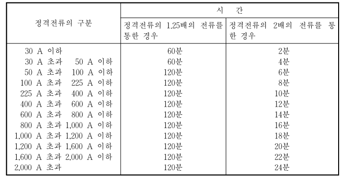 - 2. 정격전류의 1.25배 및 2배의 전류를 통한 경우에 표 38-3에서 정한 시간 내에 자동적으로 동작할 것.
