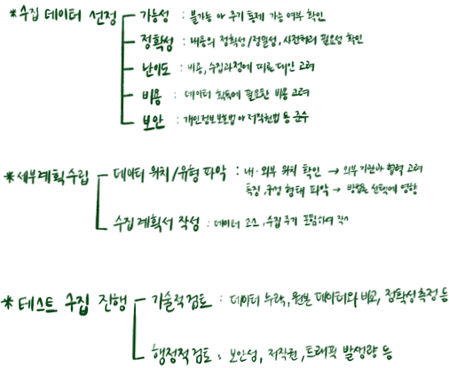 빅데이터 수집 절차 설계 : 수집 데이터 선정 -> 세부계획 수립 -> 테스트 수집 진행 -> 수집 진행