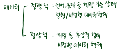 - 반정형 데이터 (Semi-structured Data) : 메타데이터, 스키마를 이용하여 표현되는 데이터 ex)XML, HTML