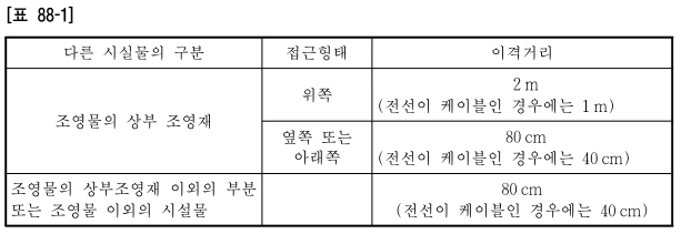 ① 고압 가공전선이 건조물․도로․횡단보도교․철도․궤도․삭도․가공약전류 전선 등․안테나․교류 전차선 등․저압 또는 전차선․저압 가공전선․다른 고압 가공전선 및 특고압 가공전선 이외의 시설물과 접근상태로 시설되는 경우에는 고압 가공전선과 다른 시설물의 이격거리는 표 88-1에서 정한 값 이상으로 하여야 한다. 이 경우에 고압 가공전선로의 전선의 절단, 지지물이 도괴 등에 의하여 고압 가공전선이 다른 시설물과 접촉함으로서 사람에게 위험을 줄 우려가 있을 때에는 고압 가공전선로 는 고압 보안공사에 의하여야 한다.