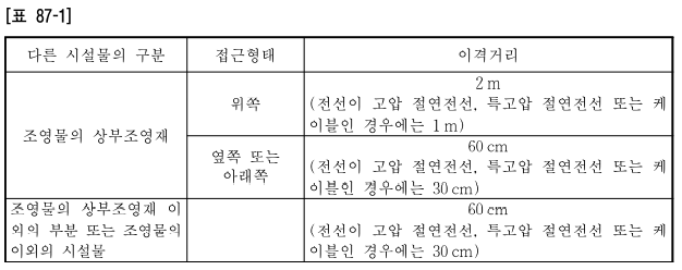 ① 저압 가공전선이 건조물․도 로․횡단보도교․철도․궤도․삭도․가공약전류 전선로 등․안테나․교류 전차선 등․저압 또는 고압의 전차선․다른 저압 가공전선․고압 가공전선 및 특고압 가공전 선 이외의 시설물과 접근상태로 시설되는 경우에는 저압 가공전선과 다른 시설물 사이의 이격거리는 표 87-1에서 정한 값 이상 이어야 한다.