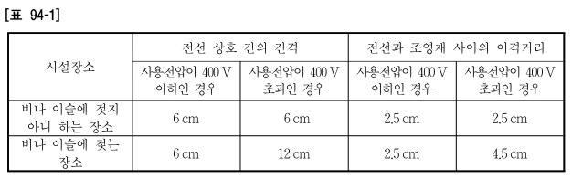 - 나. 전선 상호 간의 간격 및 전선과 그 저압 옥측전선로를 시설하는 조영재 사이의 이격거리는 표 94-1에서 정한 값