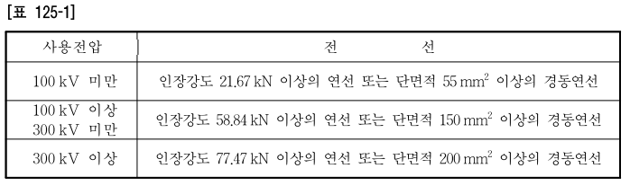 - 사. 전선은 단면적 240 mm2 이상의 강심알루미늄선 또는 이와 동등이상의 인장강 도 및 내아크 성능을 가지는 연선을 사용할 것.