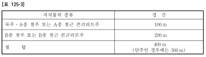 3. 경간은 표 125-3에서 정한 값 이하일 것. 다만, 전선에 안장강도 38.05 kN 이상의 연선 또는 단면적이 100 mm2 이상인 경동연선을 사용하고 지지물에 B종 철주․B 종 철근 콘크리트주 또는 철탑을 사용하는 경우에는 그러하지 아니하다