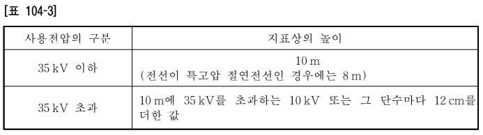 - 마. 전선의 지표상의 높이는 표 104-3에서 정한 값 이상일 것. 다만, 발전소․변전소 또는 이에 준하는 곳의 구내와 구외를 연결하는 1경간 가공전선은 그러하지 아니하다