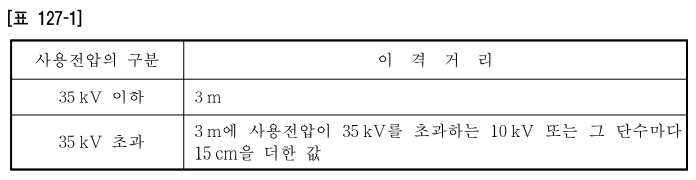 - 2. 특고압 가공전선과 도로 등 사이의 이격거리는 표 127-1에서 정한 값 이상일 것. 다만, 특고압 절연전선을 사용하는 사용전압이 35 kV 이하의 특고압 가공전선과 도로 등 사이 의 수평 이격거리가 1.2 m 이상인 경우에는 그러하지 아니하다