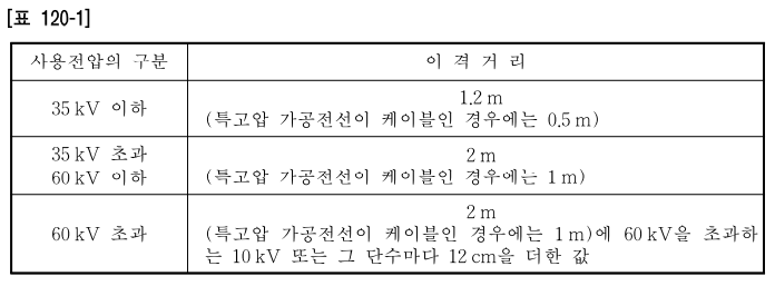 - 3. 사용전압이 35 kV를 초과하는 특고압 가공전선과 건조물과의 이격거리는 건조물 의 조영재 구분 및 전선종류에 따라 각각 제2호의 규정 값에 35 kV 을 초과하는 10 kV 또는 그 단수마다 15 cm을 더한 값 이상일 것.
