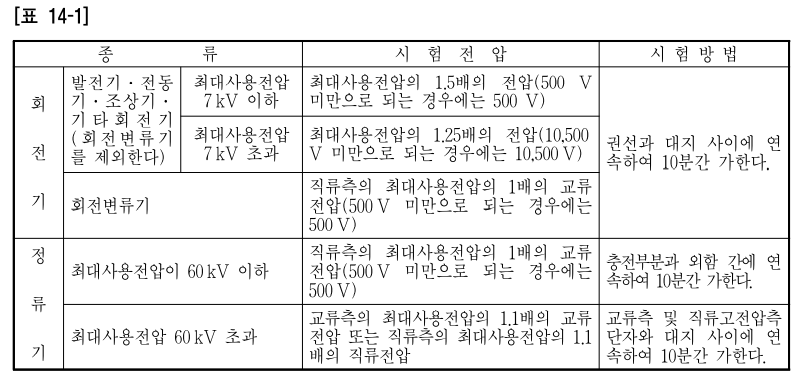 회전기 및 정류기는 표 14-1에서 정한 시험방법으로 절연내력을 시험하였을 때에 이에 견디어야 한다.