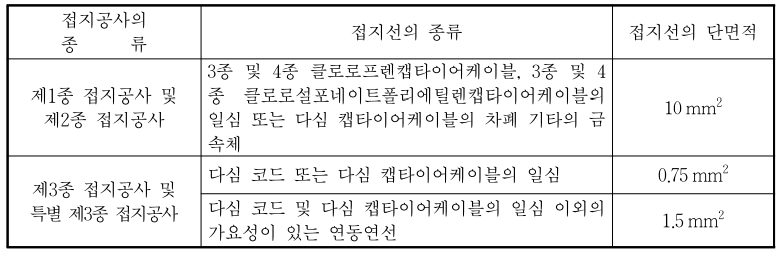 - 3. 접지선은 절연전선(옥외용 비닐절연전선 제외), 캡타이어케이블 또는 케이블(통신용 케이블 제외)을 사용할 것. 다만, 접지선을 철주 기타의 금속체를 따라서 시설하는 경우 이외의 경우에는 접지선의 지표상 60 cm를 초과하는 부분에 대하여는 그러하지 아니하다.
