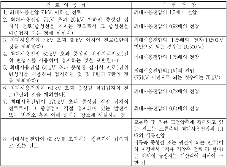 시험 전압을 전로와 대지 사이에 연속하여 10분간 가하여 절연내력 시험 (교류)